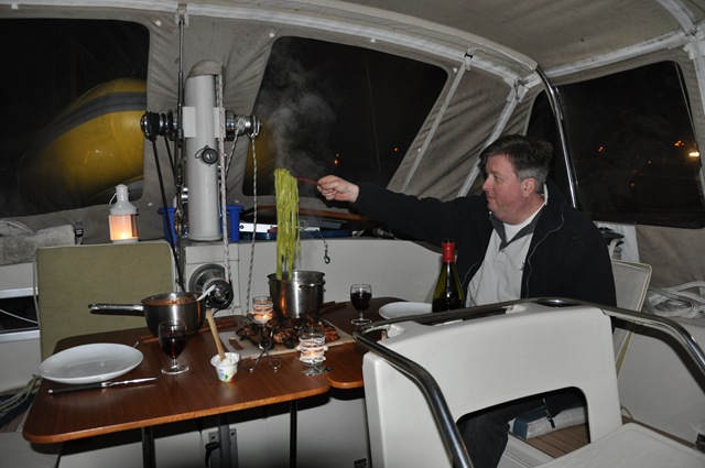 Den 27, fredag, hade vi premiär i sittbrunnen. Både middag och senare en trevlig kväll med våra båtgrannar och Andreas (Nemo of Sweden) som har köpt en båt i Kalmar och nu håller på och seglar den till Strömstad.