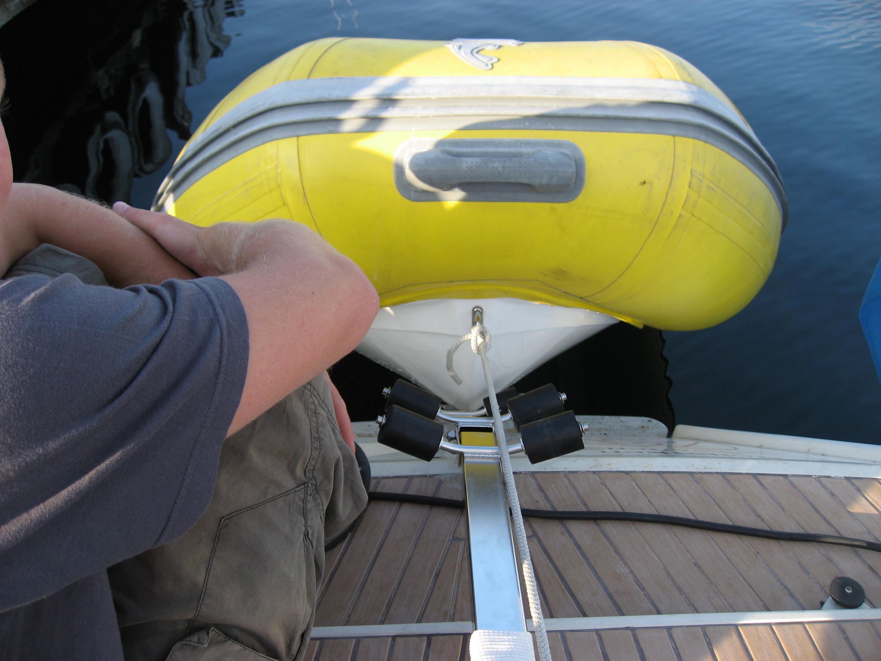Det har även varit en del båtpyssel (som vanligt). Jollen hade fått lite stryk uppe i Bohuslän av alla stenar så Jonas o Philip tillbringade en dag med att fixa till detta med hjälp av gelcoatspackel och epoxy. Vi har även fått vår Jolleslip färdig. Jolleslip? Va? Jo det är en anordning som vi fäster ovanför fönstret i akterkabinen och som ligger längs aktern och ned i vattnet. Ställning är försedd med hjul som sitter i V-formation. Detta gör att vi mycket enkelt kan sjösätta jollen genom att låta den åka kana längs anordningen (slipen) ner i vattnet. När jollen ska upp fäster vi en tamp i jollen och andra änden lägger vi runt el-winschen och drar snabbt och enkelt upp jollen på akterruff taket igen.
