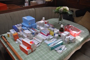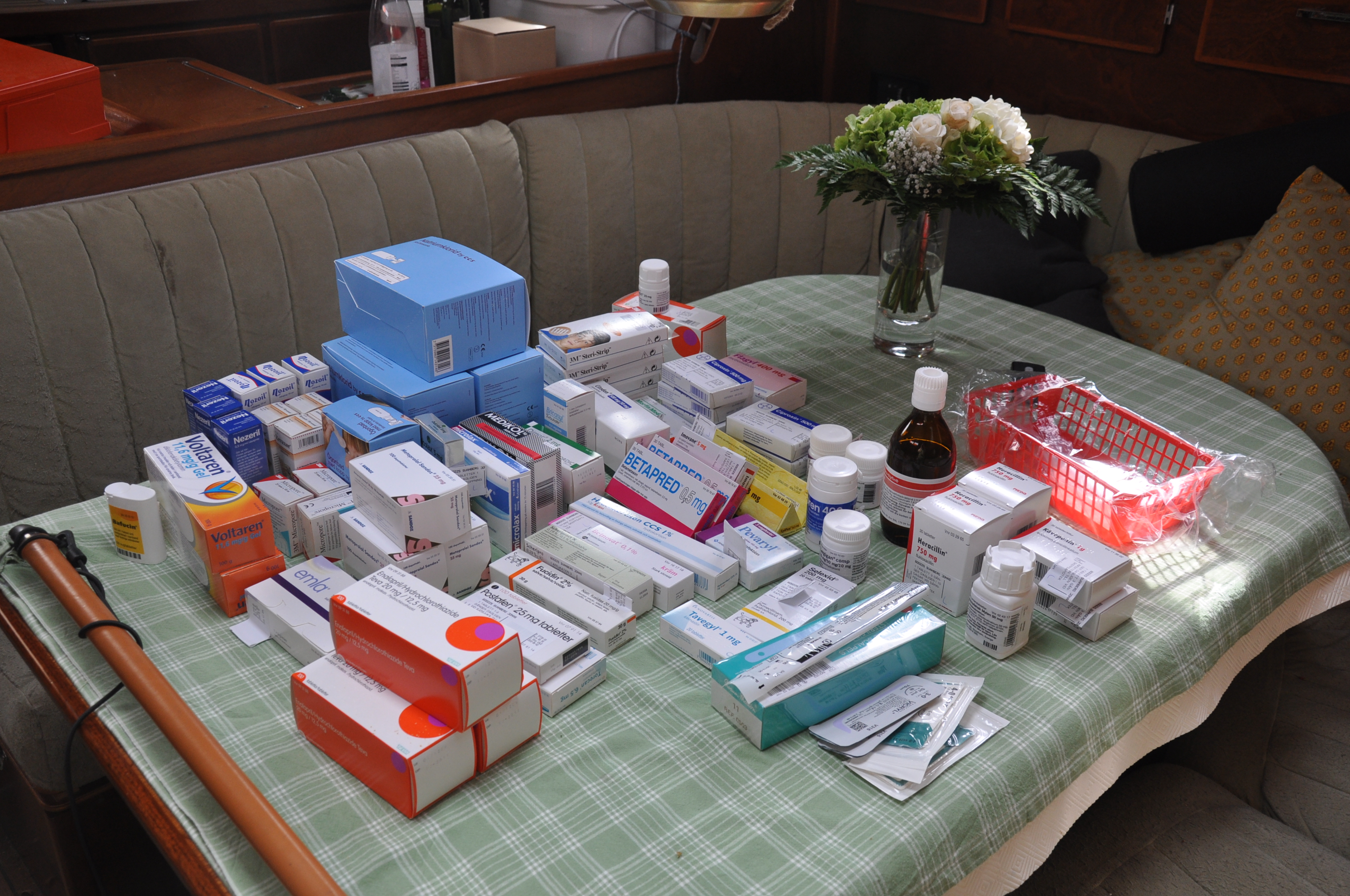 Vi har fått hjälp av en läkare på Vellinge vårdcentral med att få ihop ett skeppsapotek. Det var jag och hämtade ut häromdagen . Jösses vad myckt piller och salvor och grejer.