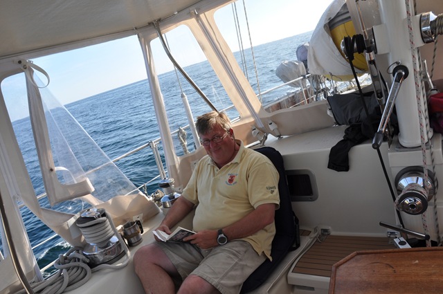 Vi hade väldigt svaga vindar hela tiden och naturligtvis rakt i nosen. Så det var motorgång i 2,5 dygn. Vi var visserligen 3 st att dela upp nätterna på så av den anledningen var det lättare. Nej, det som gjorde det så trist var ETA (Estimated Time of Arrival) Ena gången man tittade så var det kl 0600 den 1 Juli nästa gång var det kl 2300 den 30 juni. Allt beroende på strömmarna som som mest var ca 3 knop med eller emot. Lite lätt frustrerande men vi kom fram till slut. Igår kväll vid 22 tiden så hade vi efter lite palaver fått knutit fast båten vid en flytbrygga.