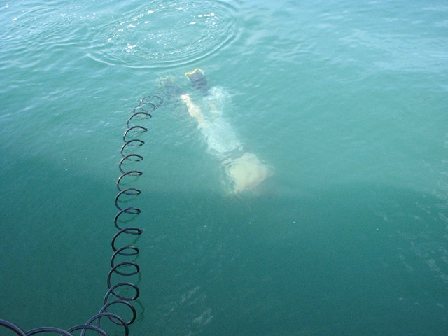 Jonas’ dyk efter arbetsbordsbenet gick nog inte helt efter reglerna. Vi förde t.ex ingen dyklogg och hade inte något utarbetat signalsystem. En tröst är dock att han fridyker inte. Inte heller dyker vi med tuber utan har en liten kompressor som står på däck och är förbundet med Jonas medelst luftslang som sitter väl förankrad i viktbältet. Så skulle det sluta att komma bubblor från dykaren så börjar dykledaren (jag) att hala och dra i luftslangen. Han dyker alltså inte utan övervakning