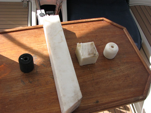 Hjulen på släden som jollen åker på, upp och ned från akterdäck, höll inte måttet riktigt. Så Jonas plockade fram svarven och fixade till två nya hjul.