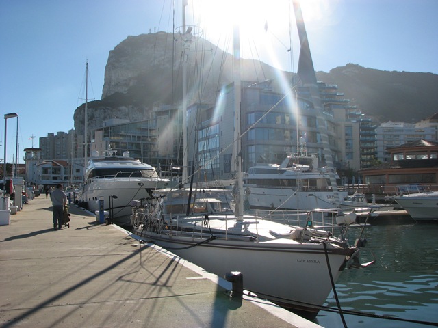 Vilken tur vi hade när vi kom till Marina Bay marina i Gibraltar. Vi seglade hit i sällskap med Amber of Ljungen och vi fick de två sista platserna i marinan. Puh, det hade blivit lite tufft att ligga på ankarplatsen då ett blåsoväder var på väg. Marina Bay är en relativt liten hamn, har väl bara ca 200 platser men kan husera båtar upp till 25 meter. För första gången sedan vi lämnade Sverige låg vi vid en betongbrygga. Dvs ingen flytbrygga utan vi fick justera tamparna allteftersom vattnet steg eller sjönk. Som tur var, var tidvattnet på lite drygt en halvmeter bara. Vi kom in i högvatten och när vattnet sjönk så behövde vi bara justera lite grand. Resten av vistelsen funkade tamplängden utan problem.
