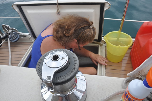 När vi bunkrade diesel i Gibraltar så överfylldes några av dunkarna och läckte i stuvutrymmet. Inte så kul då vi även har livflotten där. Så upp med livflotte och dunkar och ner med mig för sanering.
