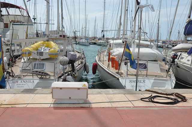Sedan fick vi en plats på den mest centrala bryggan, och den ena marineron tog emot oss även där och gick inte förrän han såg att vi fått allting på plats och låg tryggt förtöjda. Även här var det sk. Medelhavsförtöjning och den var lika jobbig här som i Gibraltar. Fast vi har vidare utvecklat vår teknik. Trossen som man får upp från botten är hyfsat tjock och av den anledningen svår att lägga runt knapen. Så vi tar en lång tamp och lägger kring stora winschen och gör en skotstek om den tjocka trossen och winschar oss på plats. Vilket gör att jag slipper kämpa som en galning med en tung och otymplig tross. Funkar kanon. Om man bara får rätt på den där rackarns skotsteken. (Pinsamt erkännande från en fd scout )