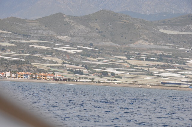 På vår väg från La Herradura letade vi efter en ny ankarplats. Jonas hittade 5 möjliga på sjökortet men tyvärr kunde vi inte ankra i någon av dem på grund av rådande vind och dyningar. Vi hade ostliga vindar och ostlig dyning och alla ankarplatserna vi hittade var öppna mot ost. Spanska Solkusten än väldigt “slät” kust, inga djupa vikar att söka skydd i så egentligen är det vara harbour-hoping som gäller. Precis som på den Svenska sydkusten.