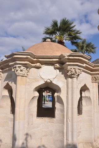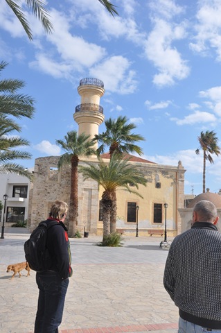På ett torg hittade vi en kyrka med vad som såg ut som ett minarettorn och en liten rund byggnad, något nedsänkt i marken. Allt såg väldigt arabiskt ut och det är kanske inte så konstigt. Vi är bara 200 sjömil från nordafrikanska kontinenten och havet utanför pirarna heter Libyska Havet.