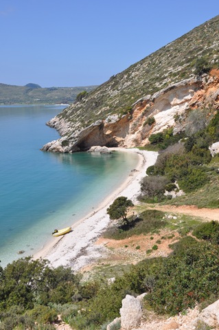 Regnet hänger i luften när vi ger oss iväg och vinden har vi rakt i nosen hela tiden. Tur att vi inte ska så långt, bara 6,5 sjömil rakt norrut. Alldra längst in i viken hittar vi en liten extra vik med några sandstränder och helt öde. Det är bara vi och getterna. Att det regnar och blåser bryr vi oss inte om. Vinden kommer från norr just nu och vi ligger i lä och regnet, tja det brukar gå över.