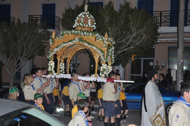 och sedan kom scouterna som bar på den här, vad man nu skall kalla den. Den är tom eftersom de är på väg att hämta den korsfäste Jesus.