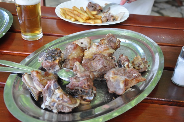 Men det var tur att kocken sa att det var kotlettrad, för det såg man inte när man fick det serverat. Styckningskonsten varierar verkligen från land till land. I Sverige hade man nog grillat hela kotlettraden på ett galler, men inte här. Kotlettraden hackades upp i mindre bitar och träddes upp på ett 1,5 långt spett innan det sakta fick rotera över glöden.