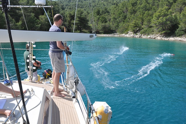 Trötta och upplevelse nöjda tog vi oss tillbaka till båten och åkte tillbaka en bit i fjorden för att förtöja vid en restaurangbrygga och äta middag. Det blev ett äventyr. För första gången fick vi en lina in i propellern. Tack vare en “hjälpsam” marinero. som tur var fick vi båten på plats vid bryggan innan linan fastnade. Ägaren till restaurangen kom, såg bekymrad ut och började ringa, samtidigt bytte Erik om till badbyxor och hoppade i vattnet och löste problemet. Restaurangägaren såg lättad ut att vi inte ställde till med herrans liv.