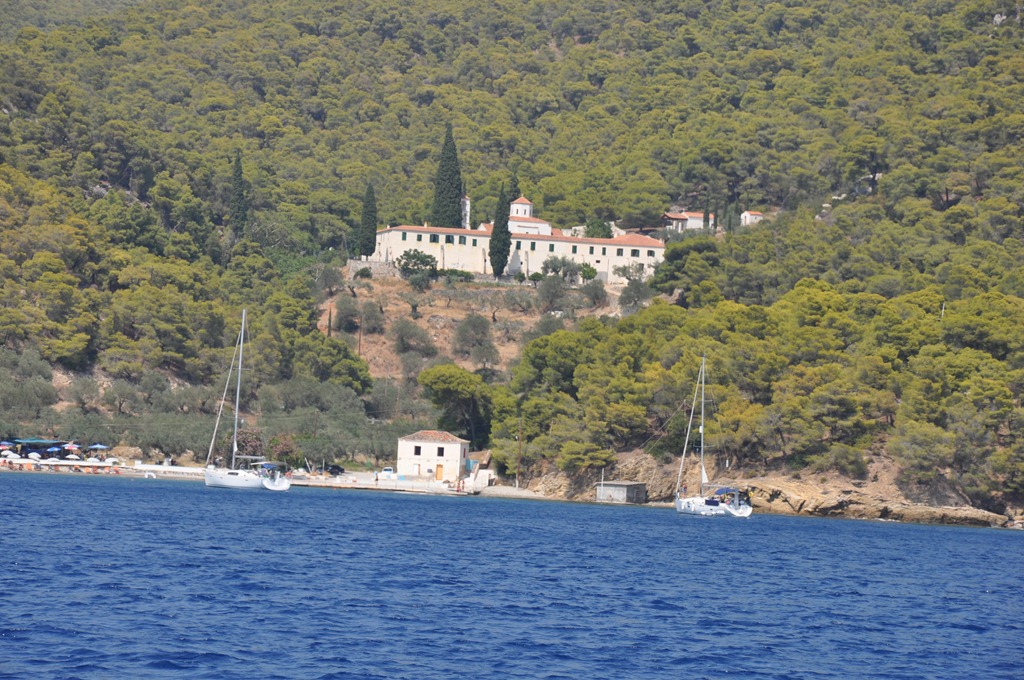 Det var lite spännande att lämna Porto Rafti, i öppningen till bukten ligger det en ganska hög klippa mitt i. Det är ca 400 m fritt vatten på båda sidor om klippan men naturligtvis fick vi en massa fallvindar precis där. Jonas är skicklig vid rodret och tog oss lugnt och tryggt förbi det hela. Trots att meltimin bara att blåst i några timmar hade vågorna hunnit bli HÖGA. Det ser lite läskigt ut när man tittar bakåt och bara ser en vägg med vatten komma emot båten. Så i nästa sekund är vågen under båten och har man tur får man en liten surf som sätter extra fart på det hela. Klart att båten gungar fram och tillbaka, men vi kränger inte. Vi fick ganska så mycket mer vind än vad väderprogrammen sagt, medelvind på ca 20 m/s och byar med det dubbla. Men Lady Annila tog oss lugnt och säkert igenom det hela. Den totala sträckan vi skulle segla var ca 45 sjömil och efter ca 2 timmar var det värsta över. Vårt mål var att segla till Poros på nordöstra Peloponessos och ju längre västerut vi kom desto mindre vind fick vi. Precis som det skulle vara. Efter 6 timmar och 46 sjömil kunde vi droppa ankare i Monestary Bay på Poros. Snittfart de första två timmarna var 8,4 knop med max notering på 11,2. Snittfart på hela seglingen blev 7,7 knop.