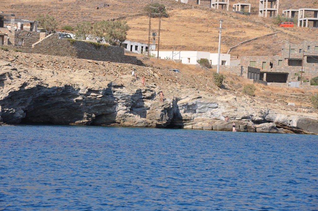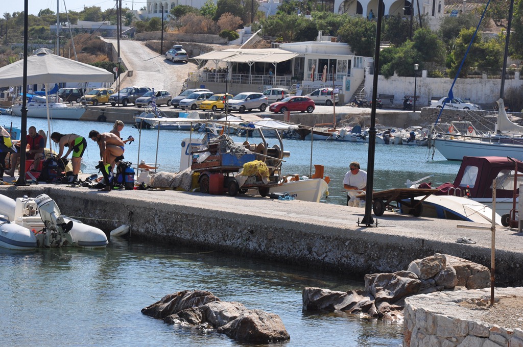På Syros stannade vi i Finikas, en liten by som var ganska långsträckt, och kändes ganska öde. Mest rörelse var det i hamnen när vi kom med dingen samtidigt som ett gäng greker skulle ut och dyka eller om de kom tillbaka från en dyktflykt. Svårt att avgöra vilket. För en del tog av sig våtdräkterna och en del tog på sig dem.