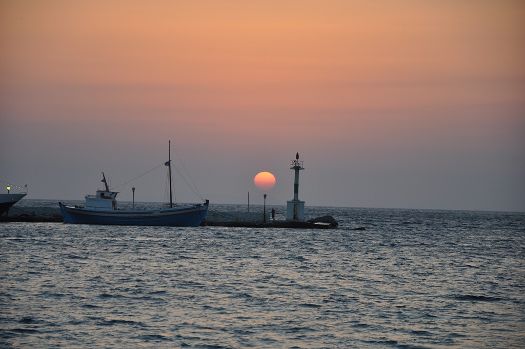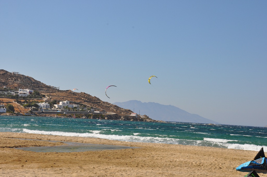 I 4 dagar har vi legat för ankare i en Ornos Bay på södra Mykonos och väntat på lite mindre vind. Ornos Bay och Korfos Bay är två kompis bukter. Då den förhärskande vindriktningen är nordlig så kan man bara ankra i Korfus Bay vid sydliga vindar och i Ornos bara vid nordliga vindar. På landtungan mellan vikarna finns byn Ornos och det tar max 5 minuter att gå mellan vikarna. Surfare av alla de sorter håller till i Korfos Bay, mycket vind och härliga vågor medan badarna och solbadarna ligger i lä på stranden vid Ornos. Här hittade vi även den fräschaste fiskbutiken på väldigt länge! Vi fick tag på både scampi och god fisk att grilla.