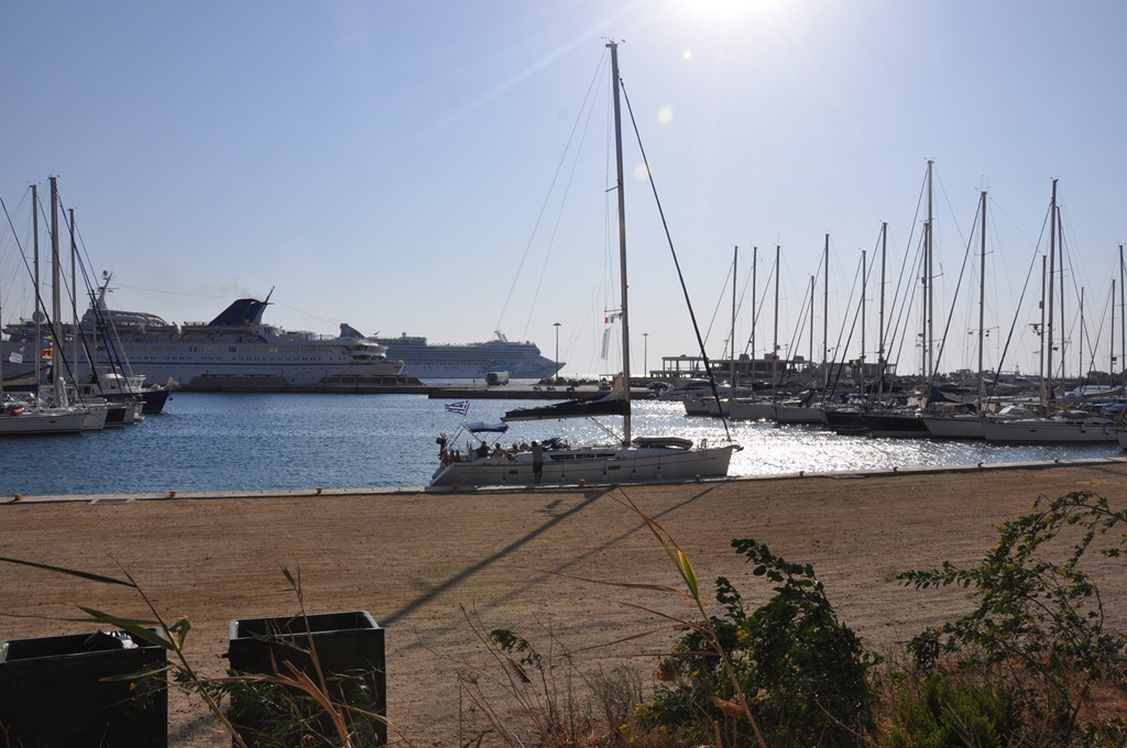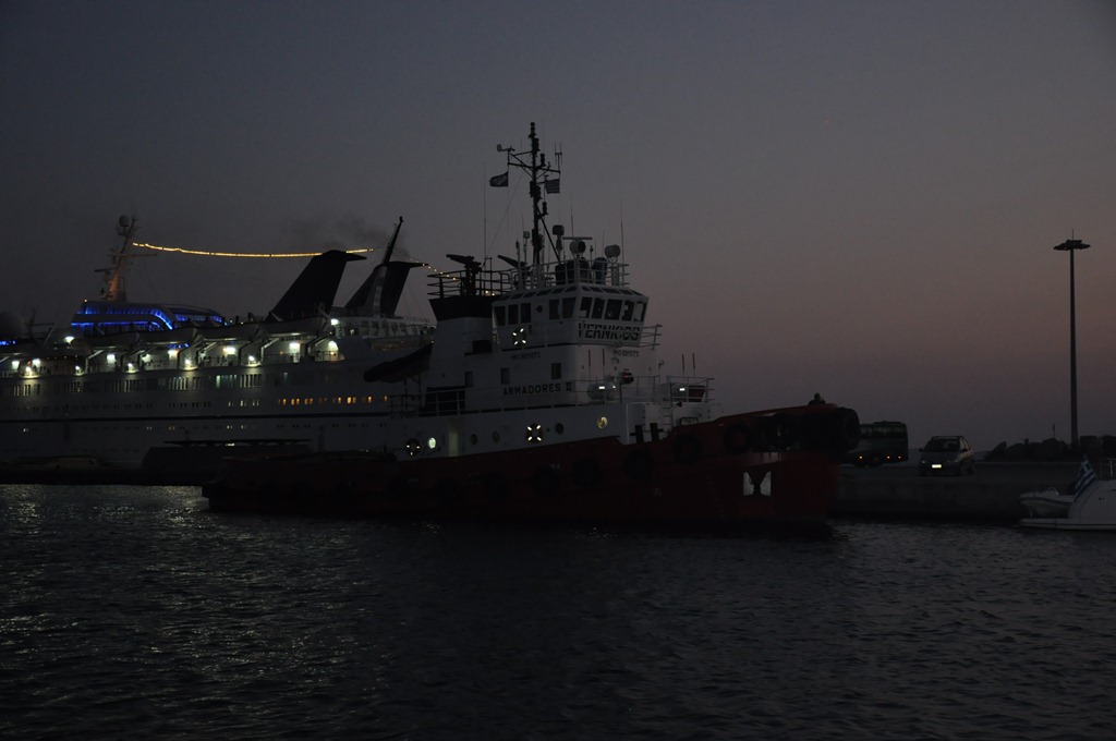 Vi ligger i den nya marinan och där delar vi hamn med en massa gigantiska krysningsfartyg och en bogserbåt som ibland får hjälpa dem att lägga till.