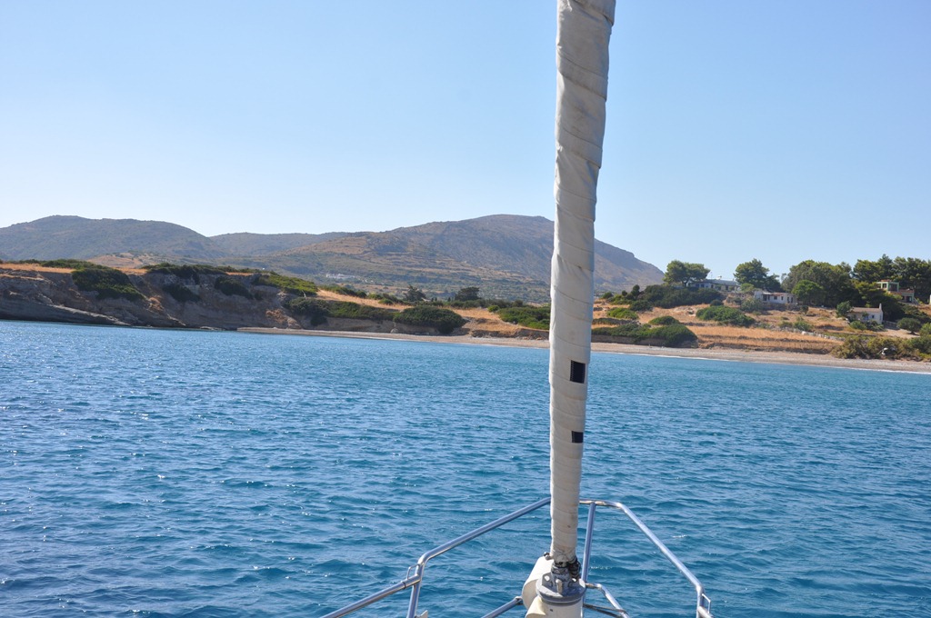 Första stoppet blir i en stor vik, Palaipoli. Har finns en liten hamn, med betoning på liten. Vi fick inte plats. Men det gjorde inte så mycket bukten bredvid var enorm och vi fick bra fäste i sanden med ankaret i lä av en klippa. Det var lite nervöst att gå in här eftersom det inte fanns några vettiga djupangivelser någonstans, varken på papperssjökorten eller i något av våra två navigationsprogram inte heller Piloten gav någon vägledning. Men sakta men säkert tog vi oss in på ca 7 m djup och lade ankaret. Jonas dök sedan ner och kollade botten. Eller dök o dök, vattnet var så klart att det räckte att snorkla på ytan. Men där var bara sand, ev kunde det vara några stenar i en tångruska men de var inte i vägen för oss.
