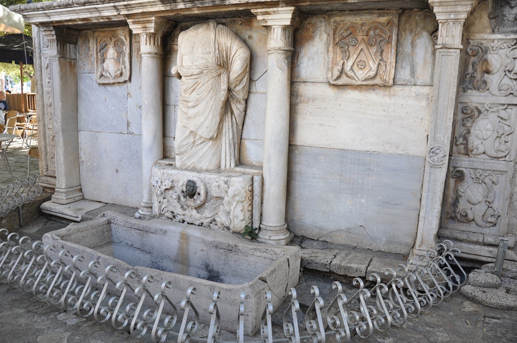 Vi tog en fika paus vid Bembo-brunnen. En brunn som byggdes av venetianarna 1588 och för att smycka brunnen använde man en gammal romersk sarkofag och en huvudlös staty av en romersk soldat samt några gamla vapensköldar. Jag blev glad när jag såg placeringen av kranen. Det hade varit lite obskyrt om de placerat kranen ca 1 meter högre upp…….