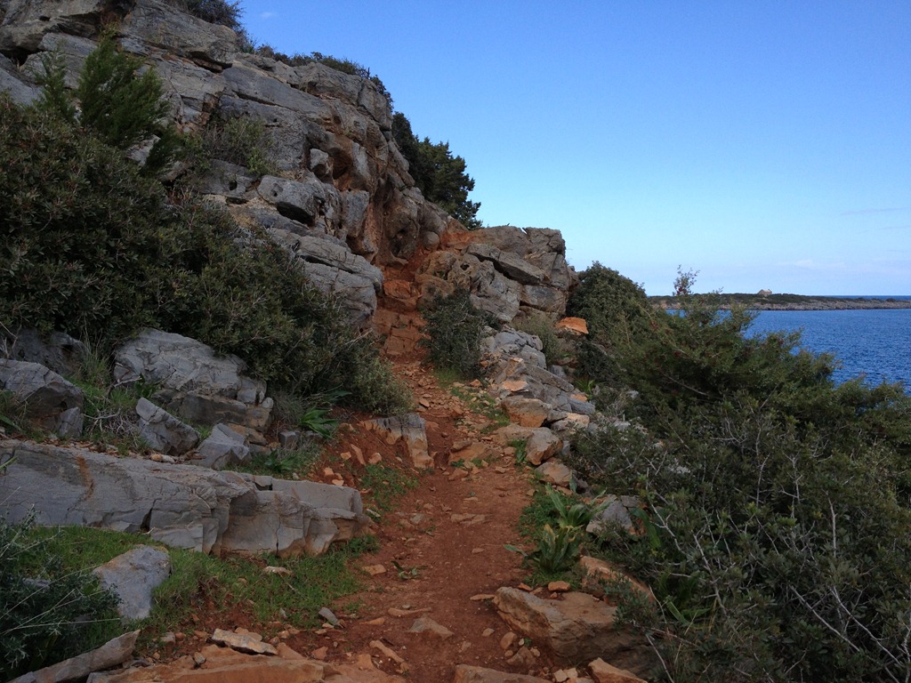 Promenaden började lovande för mig som har kondition lika med noll. En grusväg som följde kusten och med en liten lagom backe som höll på att knäcka mig totalt. Men skam den som ger sig. Jonas hade bestämt att vi skulle gå till en liten kyrka som låg ca 3 km bort, det var väl inte så farligt tyckte jag och ökade takten i en liten nedförsbacke. Strax så övergick den behagliga grusvägen till en smal, slingrande, stenig och bergig stig. Att kasta in handduken och vända om lockade men ändå inte. Det var ju attan om man inte skulle orka med en 3 km promenad.