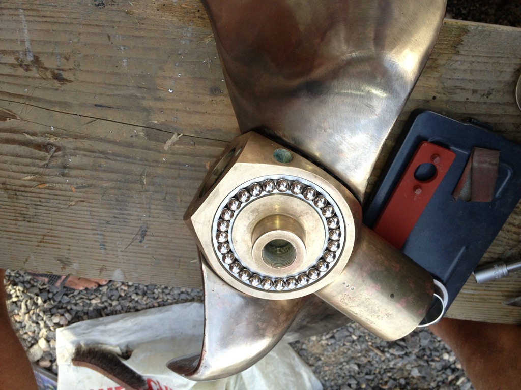 Vi har ju en flöjlande propeller, dvs propellerbladen vrider sig till rätt läge beroende på vattenströmning och antal varv den snurrar och riktning. Det innebär att varje propellerblad har 2 kullager. Vår propeller är en tidig modell och vi har öppna kullager, och de slits dels av användandet men även pga att havstulpaner och andra små snäckdjur bosätter sig i kullagerutrymmet. Det var ett litet pusslande och trixande men tillslut var alla 6 lagren på plats och propeller kunde monteras igen.
