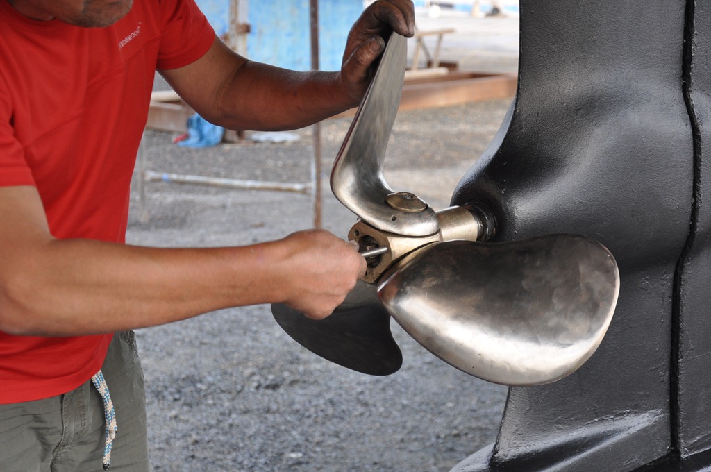 Så var det då propellern. Den demonterades relativt lätt, bara några få svordoms ramsor så var alla delarna demonterade. Sedan så polerade Jonas bort den gamla epoxin med hjälp av en hård lumptrissa på vinkelslipen och jag efterpolerade med Autosol. Bronspropellern såg ut att vara av guld…..