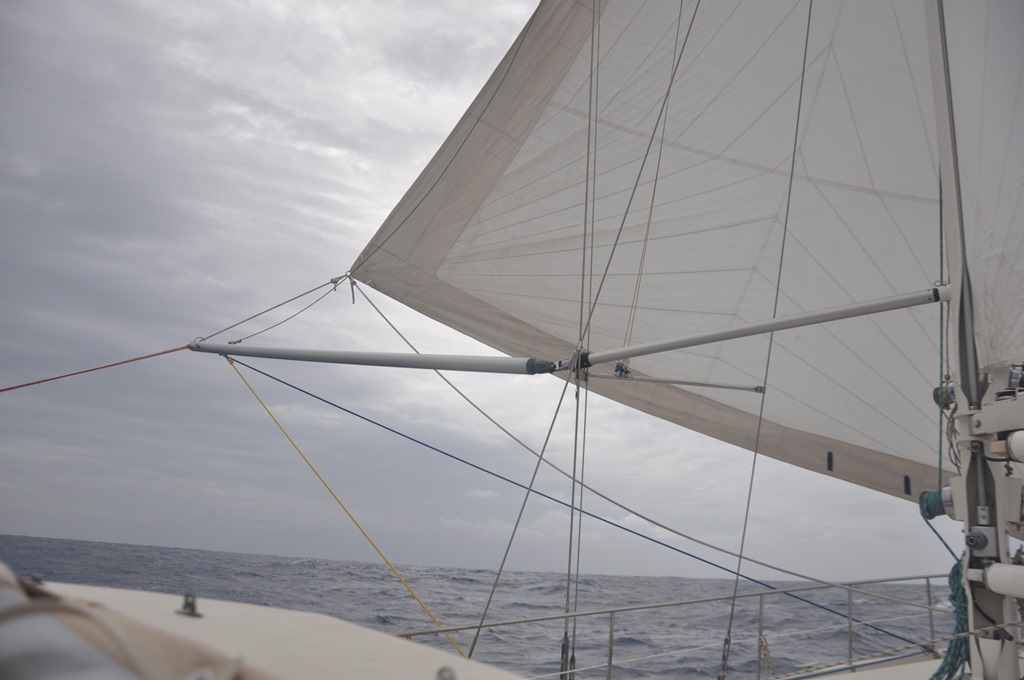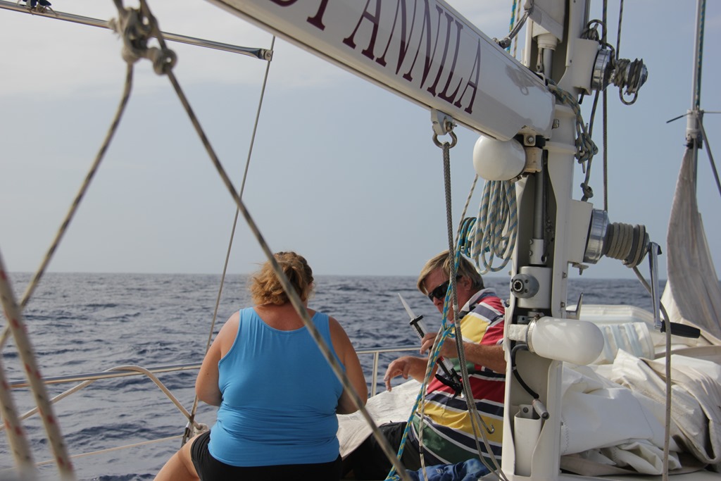 Vi fick en reva i genuan, det är det smala ljusa fältet. Och några dagar senare så tog vi ner seglet och lagade det. Här är Svanbergarna i full fart med laglappar och klister.