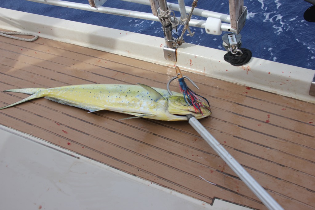 Vår första Guldmakrill! Precis landad på däck och sedan i stycknings fasen. Blodigt blir det. Glad att vi inte har teakdäck!