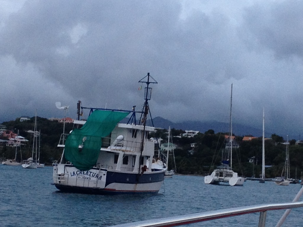 Närmsta grannen på ankringen och regnfyllda moln i bakgrunden