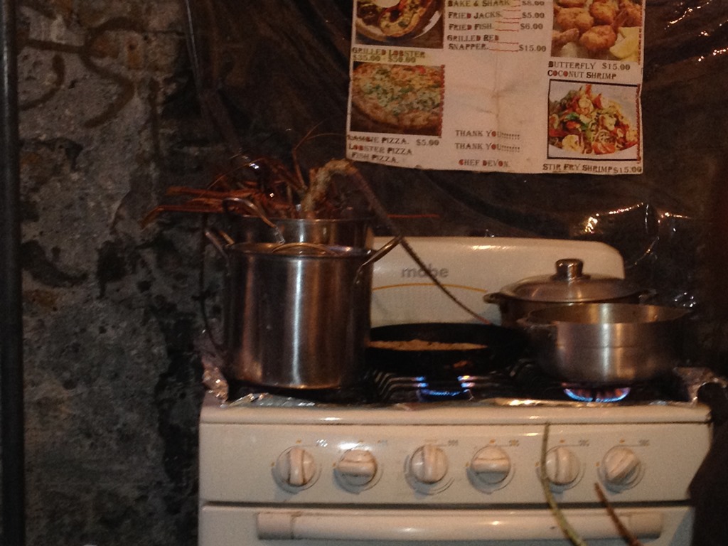 Här kokas det hummer! Först kokar man rumpan, sedan vänder man på hela härligheten och kokar huvudet. Ja, vad gör man när grytan är för liten, eller hummern för stor. När hummern väl var kokt så klövs den på mitten, grillades med vitlök och serverades med sallad och en underbart gott kryddad pasta. Mums!