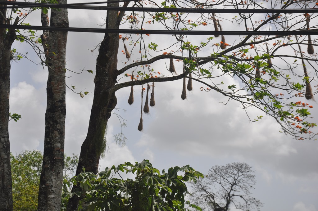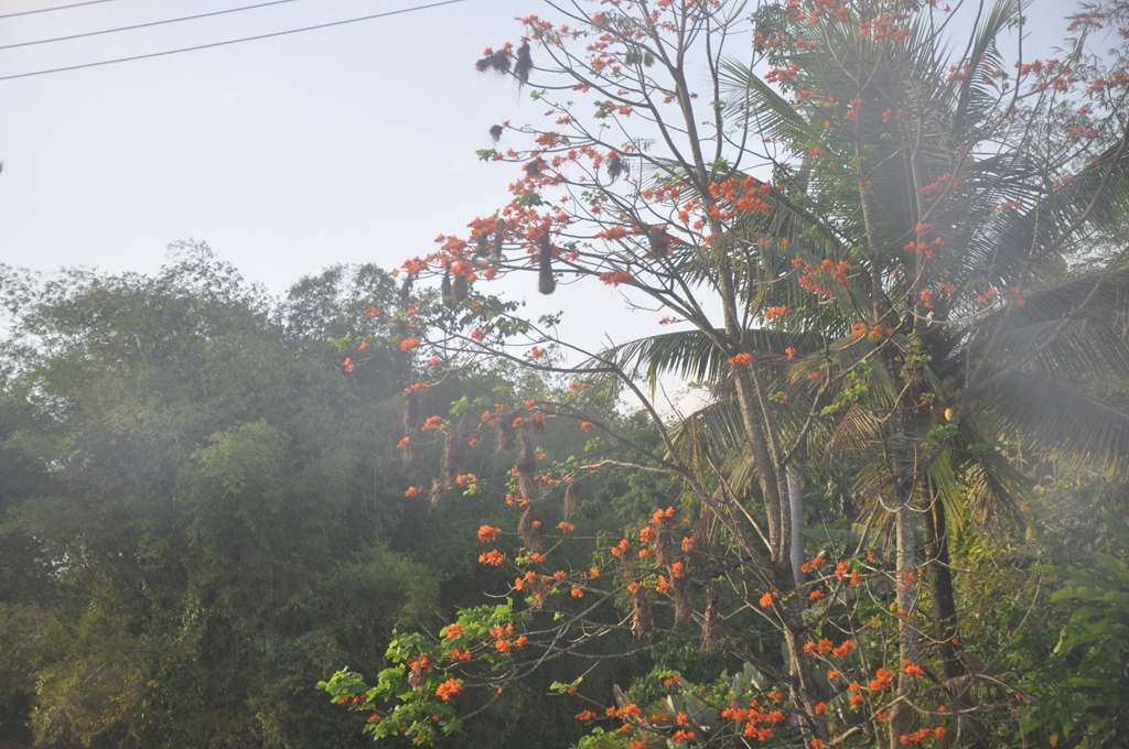 Ett antal rätter, frukter, bröd och drycker senare så körde vi förbi ett bladlöst träd med knalloranga blommor och något som hängde på grenarna. Det såg ut som om någon hade knutit fast tubsockor som man stoppat en sten i.