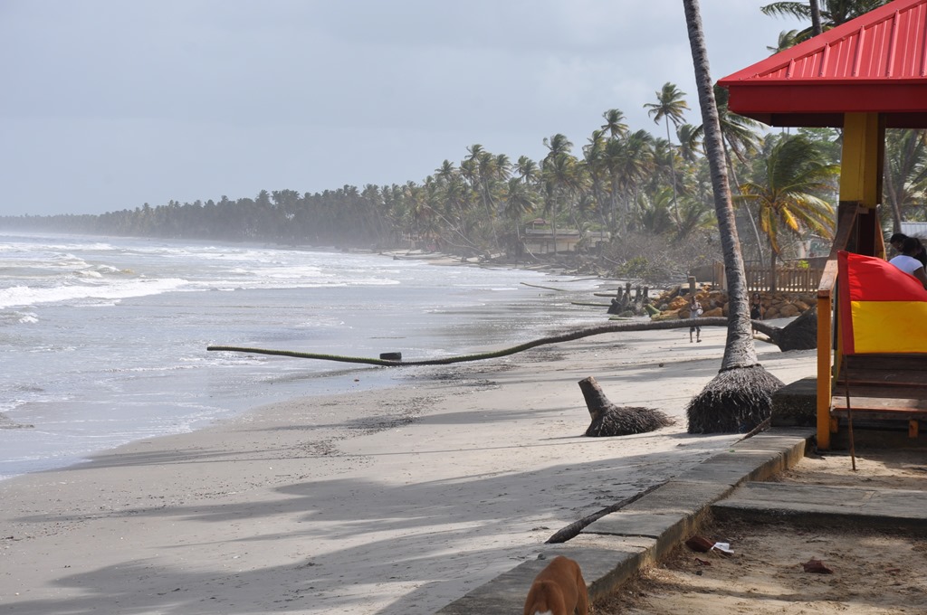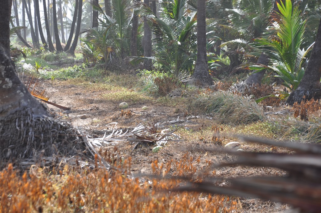 Vägen följer kusten och på andra sidan vägen är det en stor koksnötsplantage! Man får bara lov att plocka blommor här, de finns i ett sådant överflöd att det inte är något ekonomiskt i dem. Men att nalla en kokosnöt, en klase bananer eller något liknande är brottsligt och markägaren har rätt att skjuta den som nallar. Vi bestämde oss enhälligt för att det inte var värt den risken att leta efter en liten kokosnöt.