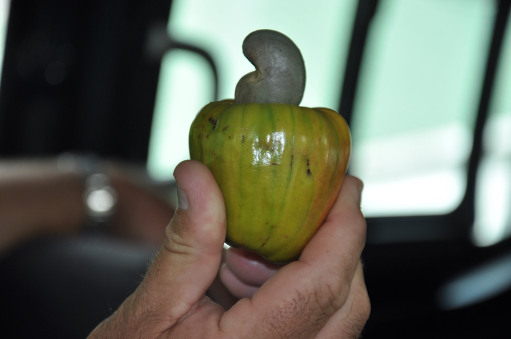 Detta är en cashew frukt med cashewnöten högst upp. Dvs en nöt per frukt!! I detta tillståndet är nöten giftig, den fräter bort skinnet där nöten haft hudkontakt dvs om man pillrar ut den från skalet. Så vad man gör är att man plockar bort nötterna från frukten och lägger nötterna i t.ex glödande kol några minuter. Man kan då se hur giftet kokar bort. Sedan är det bara att skala, äta och njuta. Själva frukten lär vara söt och saftig. Vi smakade inte.