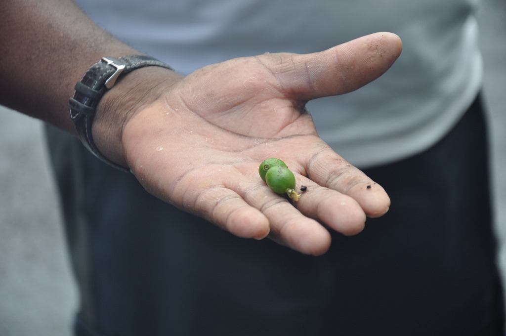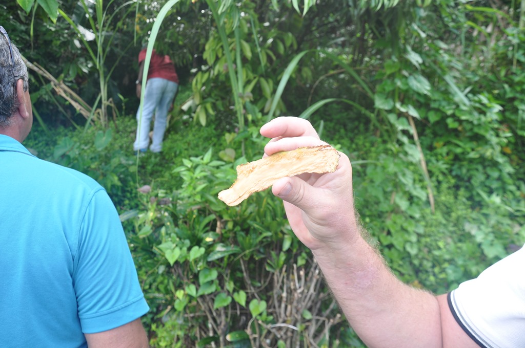 Första stoppet där hade det varit en plantage och det man såg det på var att där växte en en stor kaffeplanta, eller buske snarare, ca 5 m hög full med gröna bönor som man rostar och får kaffe. På andra sidan vägen visade Cutty oss lite av vad man kan hitta om man vet vad man skall leta efter. På bara några minuter så visade han oss Papaya, avokado, kanelträd, Gurkmeja, kryddnejlikebuske, kakaoträd, grapefrukt och Mango och detta på en yta som var runt 20 m2!