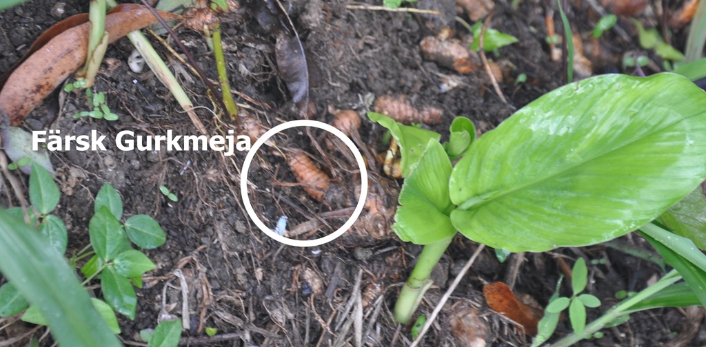 En färsk gurkmeja, Tumeric, det är rötter från det stora ljusgröna bladet, och tittar ni noga så ser ni avlånga rötter som ser ut som någon form av tjock larv. Det är färsk gurkmeja! Man river den tillsamman med t.ex kokos och blandar ner i en gryta. Eller river ner i riset. Den kallas även för Grenadas Saffran.