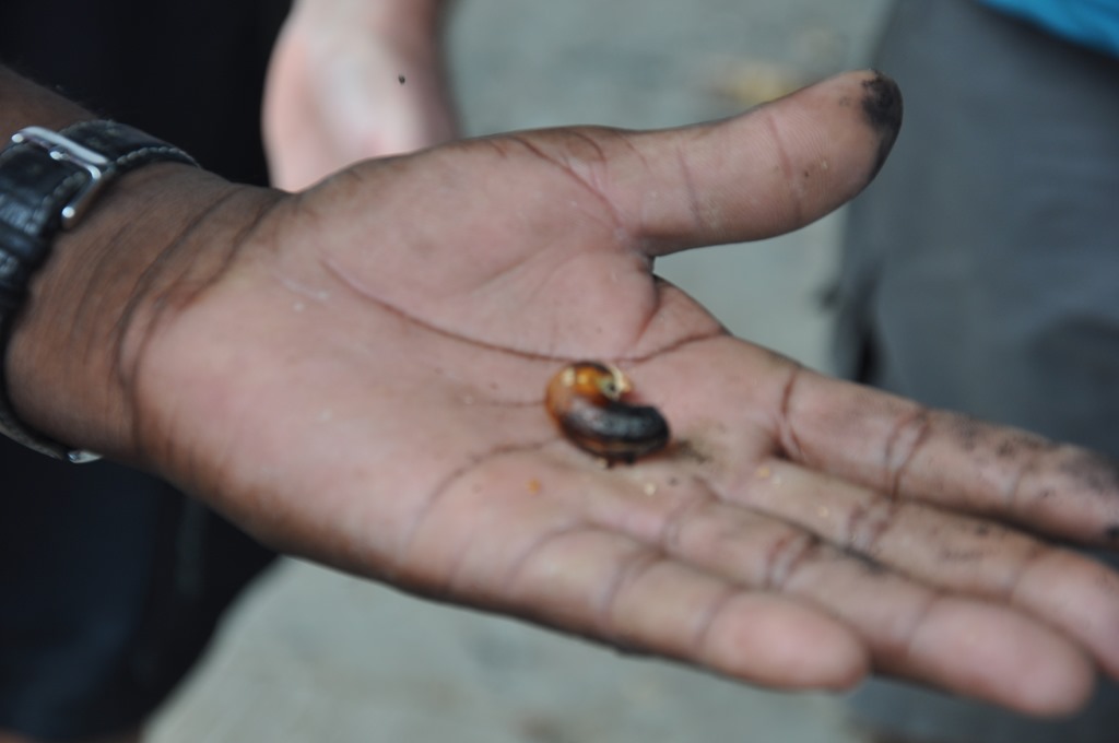 Mitt på spaden ligger det några svarta klumpar, det är cashewnötter som rostas, när man så pillrat bort det yttre skalet hittar man själva nöten.