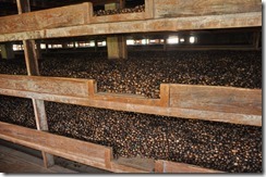 Sedan läggs alla nötterna i nätsängar för att torkas. De torkas av vinden och solvärmen. Nätbäddarna här högst upp i byggnaden precis under plåttaket som alstrar värme från solen och luftas av vinden som blåser genom de nätförsedda fönstren. Inga glasrutor här inte! En gång om dagen så rör man om bland nötterna så att alla skall torka ordentligt.
