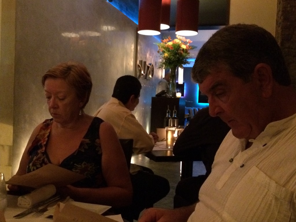 Tyvärr så hade de som designade inredningen och de som designade menyerna inte riktigt koordinerat sig. Jätte läcker belysning, men svag och bara ett ynka litet värme ljus på bordet tillsamman med Café Latte färgade menyer med skrift i svart och pyttesmå bokstäver gjorde det inte speciellt lätt att beställa. Jag frågade kyparen efter bättre belysning, han pekade på min iPhone och sa jag kunde väl använda ficklampsfunktionen i telefonen……. Märklig inställning att kunderna skall sitta med ficklampor och läsa menyn.