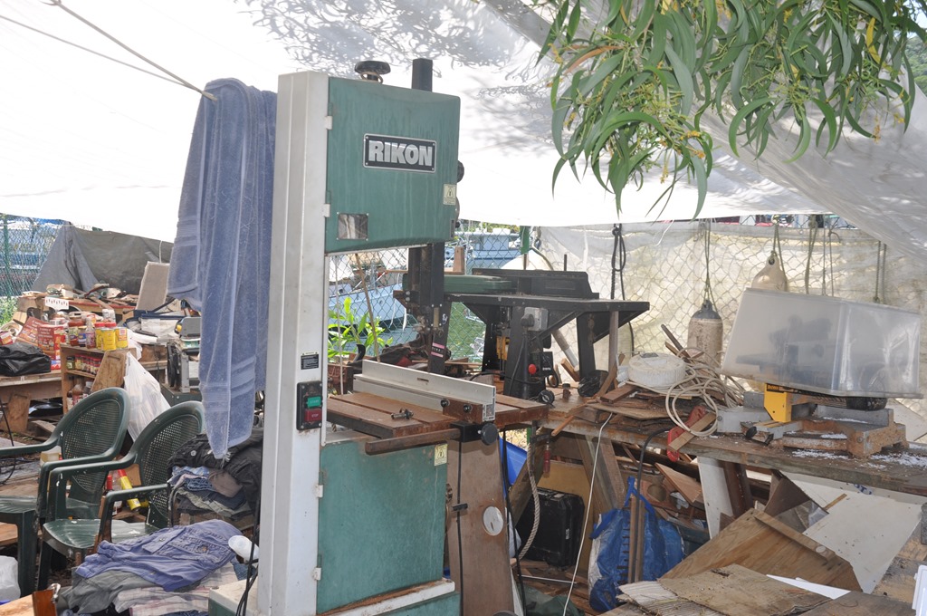 Han har täckt ett område runt båten med presenningar och där under har han täkt marken med gamla lastpallar och där lever han och jobbar. Alla verktyg, ett kök med kyl och spis. Sover gör han ombord. Sedan jag tog kortet har han köpt nya presenningar så det ser lite snyggare ut.
