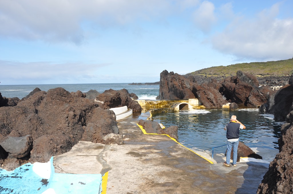 Bassängerna fylls automatiskt med havsvatten när vågorna slår över lavastenarna och dånar in genom den lilla cementöppningen. Det var alldeles för kallt för att bada och när vågorna kom in blev det riktigt strömt i den lilla bassängen. Men välidt fascinerande att se. För att komma ner till bassängerna fick man gå genom ett område med lavastenar där man hade cementerat gångvägar.