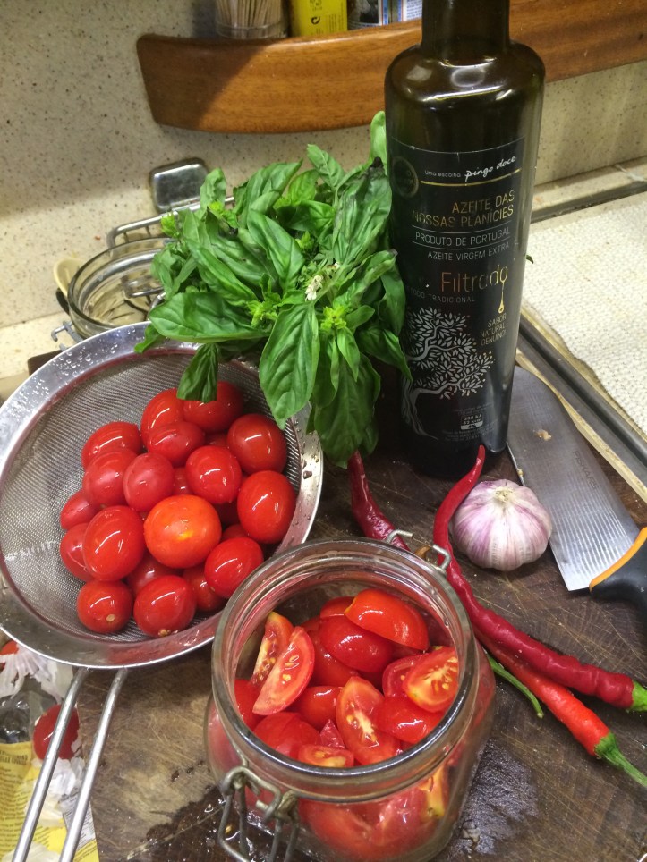 In the veggie market I bought a bag of cocktail tomatoes, perfectly ripe for 0.60 Euro a kilo (0.30 Euro per pound) and ar last Fresh chili and a big bunch of fresh Basil. What on earth are you going to do with that much tomatoes? Well it was just a bit over a kilo, and I can it! Home canned tomatoes with garlic, chili, basil and some oliv oil. You can’t buy anything like that or cheaper. That kilo became one mozarella sallad and three canned jars, for a total cost of maybe 2 Euros.