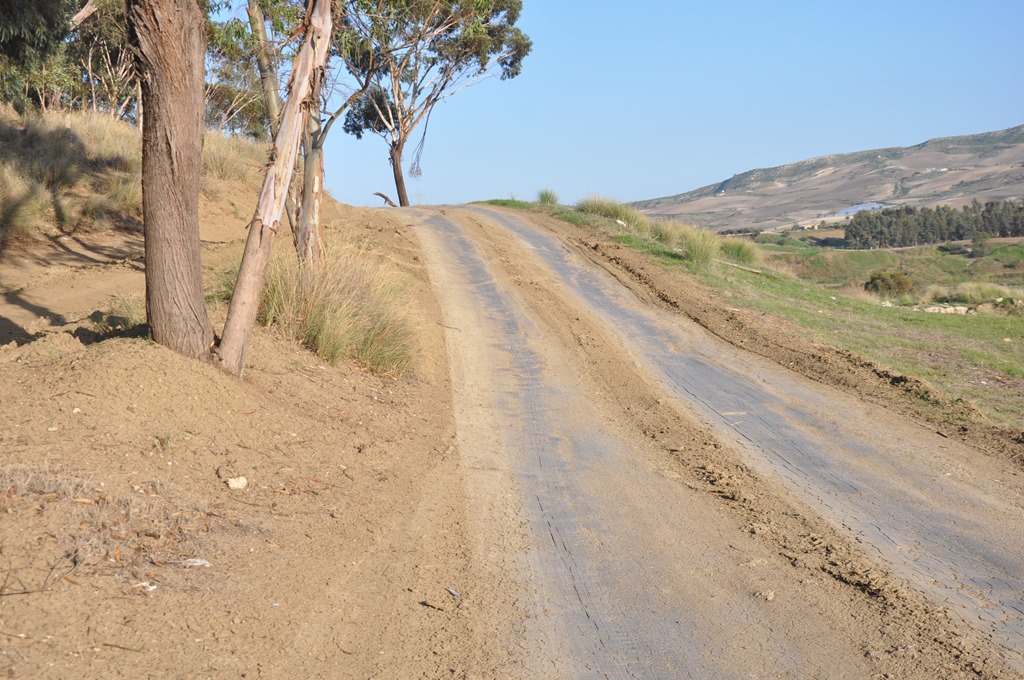 Vi tog en annan väg tillbaka till Licata och körde på en relativt ny och fin väg. Ganska så väl underhållen. Så blev vi omdirigerade ner på en mindre och betydligt skraltigare väg som slingrade sig fram mellan åkrarna och hela tiden i närheten av den fina vägen. Så långt bort i fjärran ser jag plötsligt varför vägen var stängd. En hel sektion mellan två bropelare hade rasat! Efter ytterligare några km så kom vi fram till en ny avstängingsskylt. Men denna gång blev vi inte omdirigerade. Vi stod där och tittade dumt på varandra, vad gör vi nu? Så kommer det en bil uppifrån den lilla skogen på en otroligt brant väg. Aha det är där vi ska köra. Vägen var av hårt packad lera. Hade det regnat hade vi nog inte kommit upp utan snökedjor på bilen. Väl över den lilla kullen kom vi ut på vägen igen.