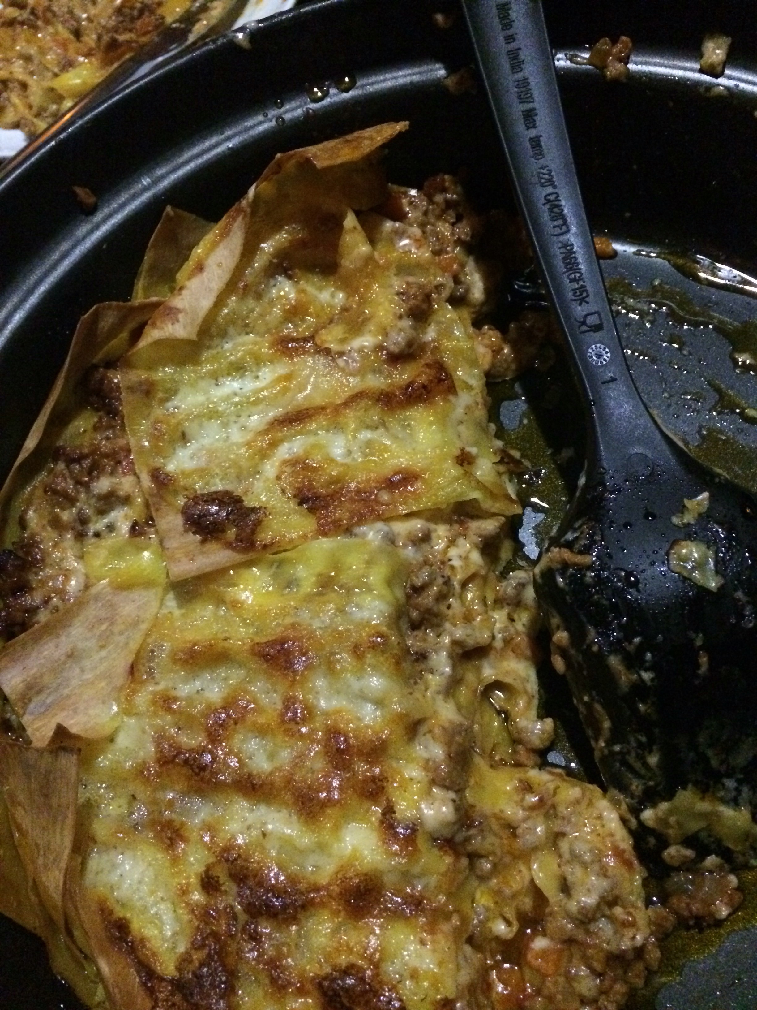 It’s actually a pretty simple dish to fix. Start by making a meat sauce with mixed minced meat, finely chopped onion, finely chopped carrot, garlic to taste, a little white wine, a little tomato puree and a jar of passata. Season with salt o pepper. Fry onion carrot and mince, add about 1 cup of white wine and let it cook in, add the tomato puree and let sizzle for a while, season and add the last passata toghether with 1/2 a cup of water. Let cook for a few minutes.