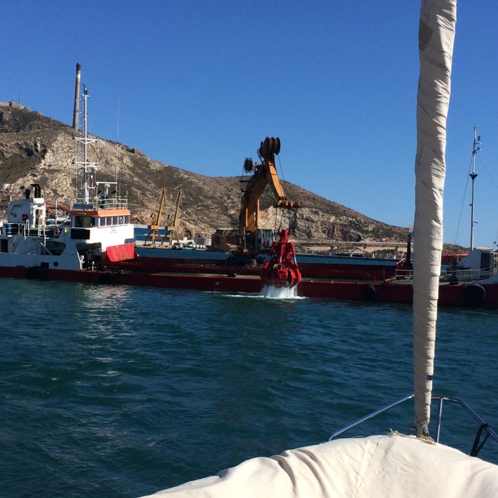 Cartagena, Spanien. Det ÄR skillnad på hamn o hamn. I Licata var det väldigt lungt, inte mycket som hände. I Ibiza Marina var 98% av båtarna tomma och enda underhållningen var när en stor färja kom in i hamnen. Cartagenas Marinor delar hamn med kryssningsfartyg, containerbåtar, Räddningsbåtar och marinen. Finns säkert en kustbevakning också. Det mest udda är en städbåt. En arbetsbåt kanske 10 m lång som på däck har div soptunnor och oljesanerings utrustning. De kör runt i hamnen 2 ggr per dag och plockar upp skräp. Himla bra tycker vi.