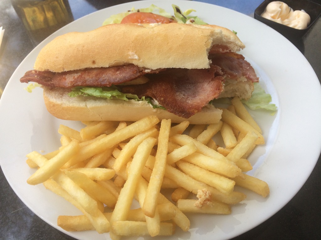 We were really pleased. Half a baguette filled with wonderfully crispy English bacon and juicy slices of tomato and a little mayonnaise. A comfortable serving with new good fried chips and a small bowl of mayonnaise. The salad was placed under the bread.