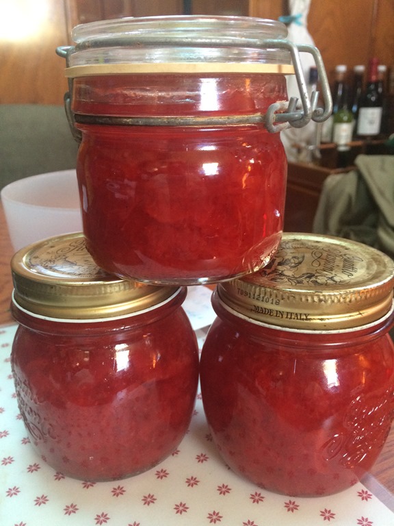 Men vad göra med de överblivna. Att proppa i oss nästan 2 kg jordgubbar funkar inte. Vi har prövat tidigare och kasta hade jag absolut ingen lust till. Så konservglas plockades fram och sockerförrådet länsades. Jordgubbarna snoppades och skivades och fick koka till läcker jordgubbssylt.