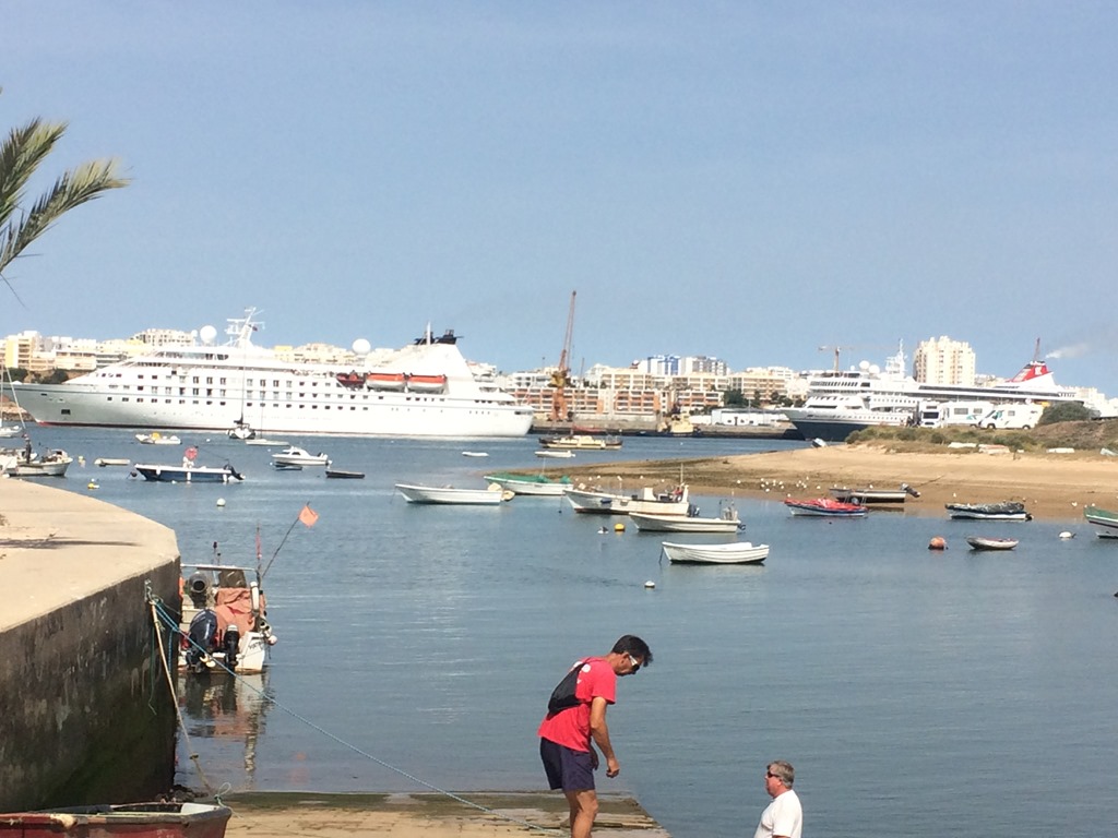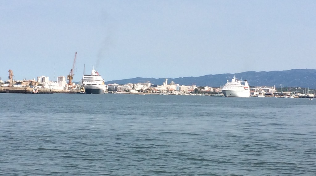 On Wednesday a blue cruise ship arrived, nothing strange about it really. It tied up at the cruise terminal and did not make much noise. Yesterday morning came another cruise ship. Now it was a bit exciting. The blue did not seem to prepare any departure and the cruise terminal has just enough room for one boat. Then we noticed that the new one was beginning to turn around and go back and forth very very close to the boats that are anchored a little further up the river, just outside Ferraguda. Had I been on one of the boats my hart would have been in my mouth.