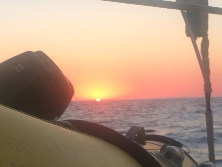 Solen går upp vid 0630 i ett orangerosa sken. Är nog ganska mycket Saharasand i luften. Vi har lungt väder, vindar på under 5 m/s så motorn får jobba. Det har blåst ganska ordentligt i Gibraltar Sund i några dagar och vi får nu resterna av vågorna. Ganska ordentliga dyningar som vi får in för ifrån.