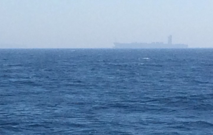 Vid 0730 väckte jag Jonas, jag måste få någon sovtimme till. Jag väcks någon timme senare med nybryggt kaffe och dukat frukostbord. Dimman har lättat och solen värmer skönt igen. Men vi har fortfarande dis som gör att sikten är begränsad till någon sjömil. De stora lastfartygen dyker upp som spökskepp i diset.