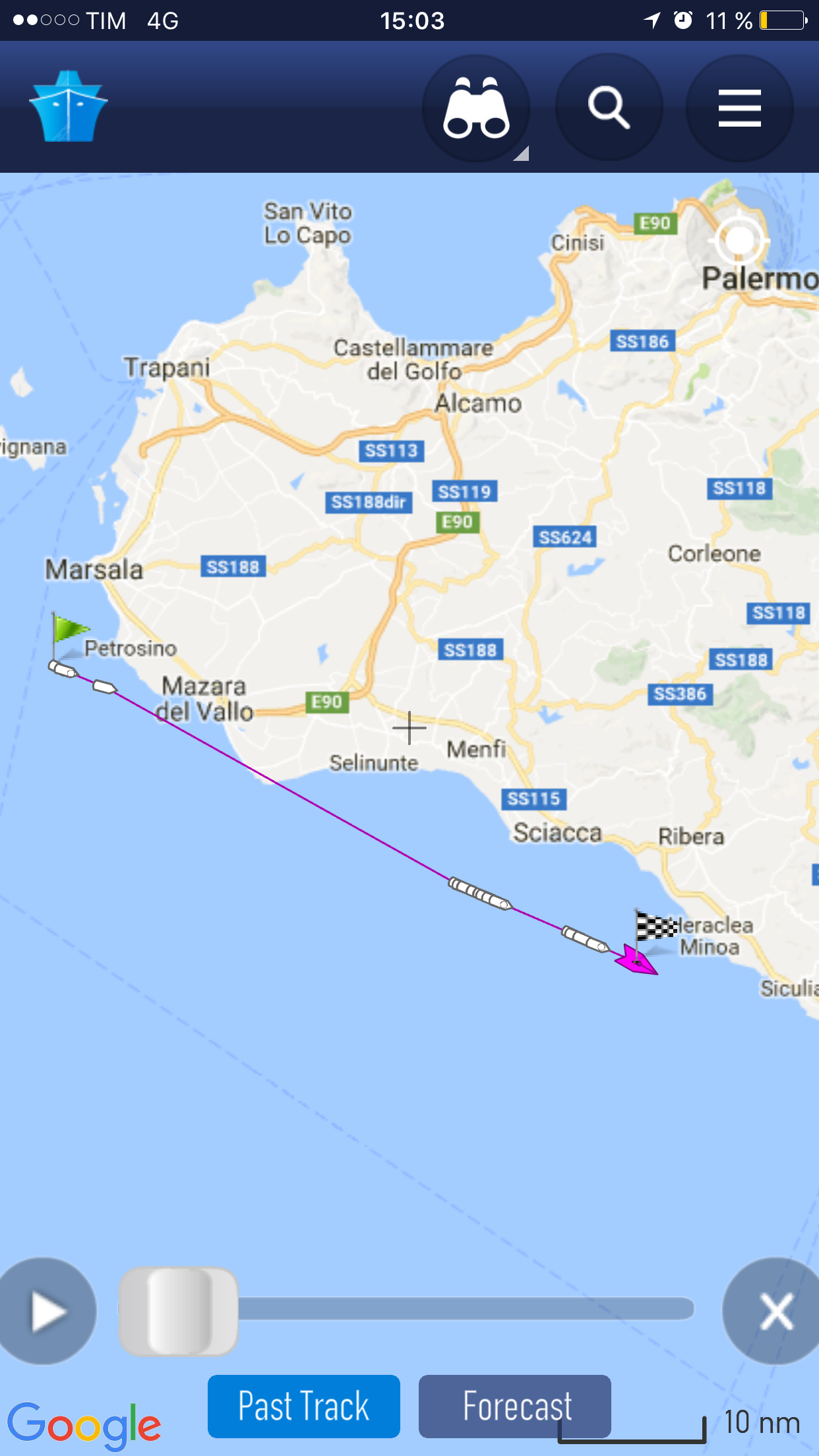 Vinden hade blåst färdigt då motorn fick jobba i drygt ett dygn innan vi var framme i Marsala di Vallo på Sicilien. Vi ankrade upp innanför pirarmarna men utanför hamnområdet, som huserar en marina och Siciliens största fiskehamn. Vi ligger kanske 300 m från stadens strandpromenad som blir vackert upplyst på kvällen. Vad som slår oss är att det är så tyst. Vi ser bilarna och folket som rör sig. Inte en massa diskodunk eller bilar som tutar inte heller något skrikande o tjoande. Någon timme senare så hör vi musik, men på en behaglig nivå som bara ger en skön bakgrund till den ljuvliga kvällen.