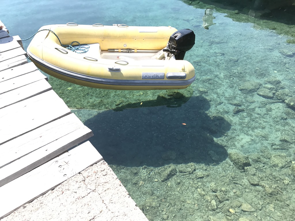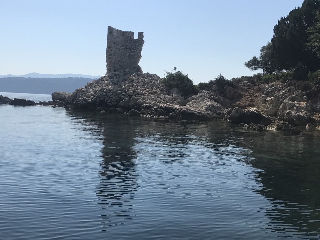Viken är ganska djup 10-25 m så de flesta lägger sitt ankare och vänder båten med aktern mot land och förtöjer i land. Då ligger båten stilla och man behöver inte ha så förfärligt mycket extra kätting ute. Men vi hittade inget bra ställe för den sortens ankring men däremot et grundflak på lagom avstånd från land och “bara” 10 m djupt där vi lade ankaret. Prognosen var lite vind från norr, men åt det hållet hade vi lä så vi var inte så oroliga. mer störande var en charterbåt med en italiensk familj ombord. Ett gäng vuxna och två barn mellan 2 och 5 år kanske. Djädrar i havet vilket liv de förde. Lät som värsta dagislekplatsen. Suck, men italienare brukar inte ligga kvar för ankare över natten. De brukar dra sig mot marinor och restauranger framåt sen eftermiddagen så vi var inte så oroliga. Vi hade rätt! Vid 18-tiden lyfte de ankare och försvann och lugnet lade sig över bukten. Någon timme senare kom fåren ner för att dricka. Så härligt att höra deras bräkande, oroliga tackor som ropade på lammen och lammen som lika oroligt svarade och så baggarna med klockor kring halsen som klingande så mysigt.