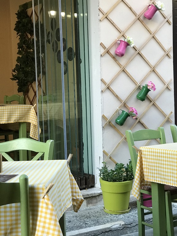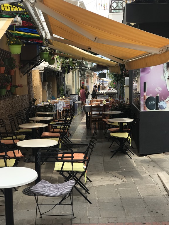 Down at the seafront, the narrow alleys fill up with restaurants and bars. Wondering if there are guests for all the chairs …
